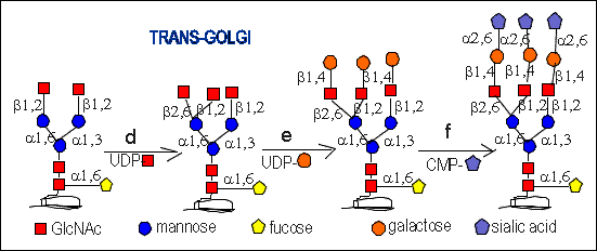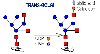 Then in the trans-Golgi galactose and sialic acid residues are added.