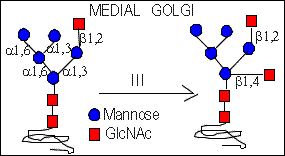 The hybrid type oligosaccharides are synthesized when the N-Acetylglucosaminyltransferase III acts prior to the action of Mannosidase II (in medial-Golgi compartment). GlcNAc-T III adds GlcNAc residue which is linked (beta 1,4) to the core mannose residue. It prevents the action of mannosidase II.