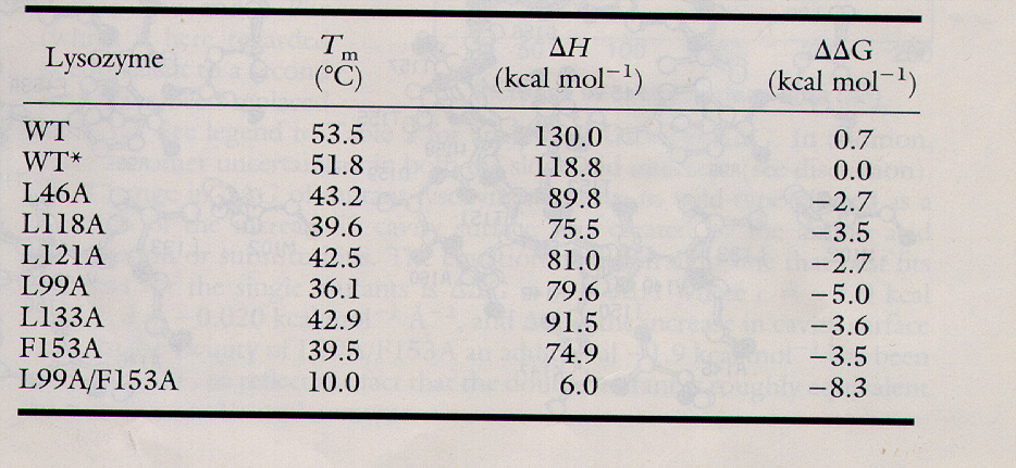 Rearrangement of structure upon mutation must always compensate the loss of missing interactions.Eriksson have solved the crystal structures of mutants of T4 lysozyme containing mutations in the hydrophobic core.They have observed that the maximum changes in energy occur where the mutant has the full-sized empty cavity.As the cavity collapses because of neighboring side chains moving in, one observes correspondingly smaller changes in energy. It seems that the higher the packing density, the stronger the van der Waals interactions and also among the surrounding side chains, which are thus less likely to collapse into the cavity fromed upon mutation. As the hydrophobic interactions are cumulative, the effects of removing several methylene groups cause the largest decrease in stability.