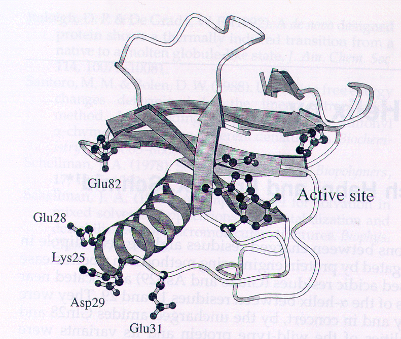 In ribonuclease T1,two surface-exposed acidic residues , GLu28,Asp29, are located near the carboxyl terminus of the alpha helix between residues 13 and 29. In case of Glu28Gln and Asp29Asn, there are a marginal stabilization of about 3.2kJ/mol. This stabilization is caused by unfavorable electrostatic interactions of Glus28 and Asp29 with the negative end of the helix dipole.
