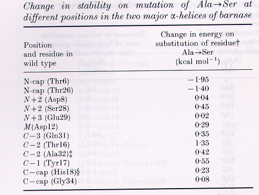 The importance of amino acid side-chains in helix stability has been investigated by making a series of mutations at the N-cap, C-cap and internal positions of the two alpha helices of barnase.
