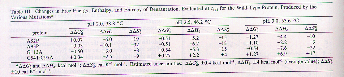 Hu studied by means of DSC the effects of replacing Ala82 and Ala93 by prolines. Ala 82 is one residue removed from the carboxy terminus of the helix formed by residues 81-91, and since Ala is usually classed as a good helix former and pro as a poor one, the mutation Ala82/Pro might have been expected to result in destabilization.Unexpectedly there have been an apparent stabilization. Therefore the introduction of proline residue decrease the configurational entropy of the unfolded form, producing a stabilization of the native form.It is the same case for Ala93Pro.