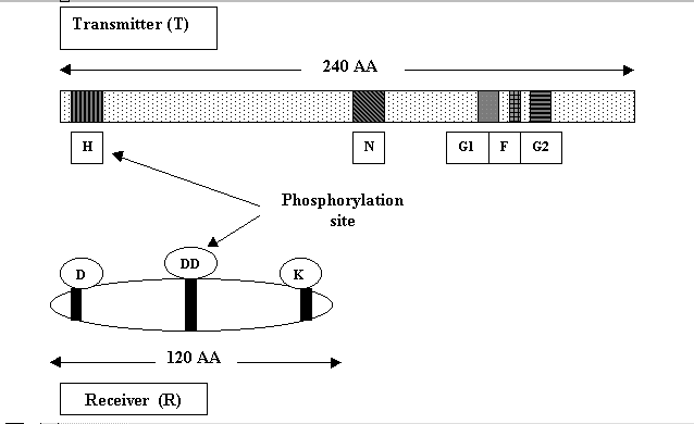The sensor component is a histidine protein kinase. The N-terminal domain of this protein kinase functions as the input region, detecting environmental stimuli directly or interacting with an upstream receptor. Many sensor domains are embedded in the cellular membrane. Extremely varied sensor domain - reflects variety of signals. Kinases are activated by a signal to phosphorylate the response regulator. In the absence of a stimulatory signal most are phosphatases of their phosphorylated response regulators. Fine-tuning of the transcription level is directed by a response regulator to correspond to the level of signal input.