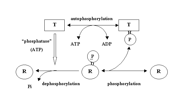 In addition to their kinase activities, histidine protein kinases such as EnvZ and NtrB also act as phosphoprotein phosphatases, accelerating the dephosphorylation of their cognate response regulators, OmpR or NtrC, in an ATP-dependent fashion. The combined kinase and phosphatase activities of the protein kinases thus act to control the amount of the phosphorylated form of the response regulator present in the cell, in response to environmental signals.